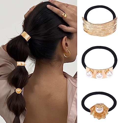 Yean Cravatta per capelli in metallo con perle e corde elastiche per coda di cavallo per donne e ragazze (confezione da 3)