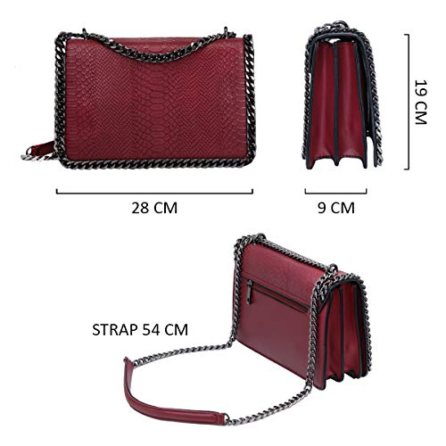 CRAZYCHIC - Borsa a Tracolla Spalla Catena Donna - Borsetta Trapuntata Serpente Pitone Moda PU Pelle - Clutch Pochette Sera Borsa a Mano Quilted Chains Messenger Crossbody Bag - Bordeaux Rosso
