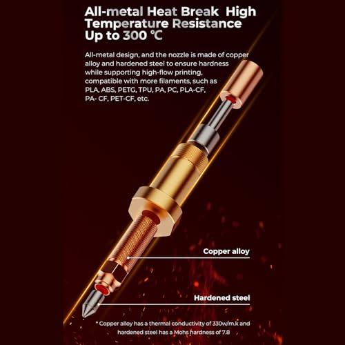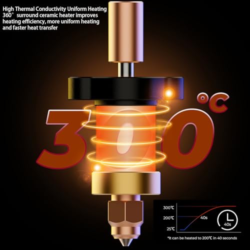 Lega di titanio resistente al calore, resistenza alle alte temperature: design interamente in metallo, prestazioni complessive più potenti, supporta la stampa ad alta temperatura a 300 ° C, compatibile con più filamenti, come PLA, ABS, PETG, TPU, PP, PC, Nylon, eccetera.