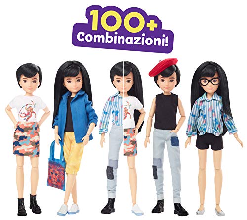 Trasforma la bambola scambiando e abbinando i 6 indumenti: 2 maglie, 1 giacca con cappuccio, 1 gonna, 1 paio di pantaloncini in stile orientale e 1 paio di jeans con toppe;