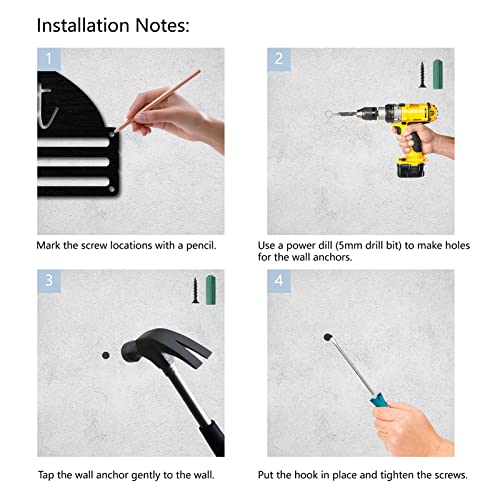 [FACILE DA INSTALLARE]:① Crea le posizioni delle viti con una matita. ② Utilizzare un trapano elettrico (punta da 5 mm) per praticare i fori per gli ancoraggi a parete. ③ Tocca delicatamente l'ancoraggio al muro. ④ Mettere il gancio in posizione e serrare le viti. (NOTA: mantenere la distanza tra l'ancora e la vite per evitare che il gancio della medaglia si attacchi al muro, in modo da facilitare l'impiccagione della medaglia)