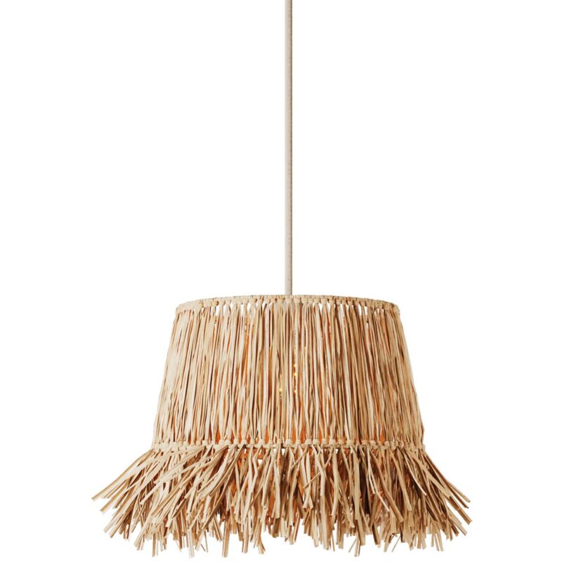 Il paralume in rafia Honolulu completo di frange ha un aspetto esotico e un cuore ecologico. Ogni esemplare, infatti, è fatto a mano con le foglie più grandi della palma Raphia, al 100% biodegradabile e compostabile. Questo materiale super flessibile,dal fascino etnico, è perfetto per creare paralumi belli da vedere e che aggiungono una luce morbida e accogliente a ogni stanza, trasformandola in un angolo tropicale. Grazie alla loro semplicità sofisticata e al profondo legame con la natura, si adattano perfettamente a diversi stili di arredamento e regalano un senso di artigianalità a ogni ambiente. Dimensioni: Diametro: 35,5 cm Altezza: ~33 cm Materiale: foglie di palma Raphia - 100% biodegradabile e compostabile;