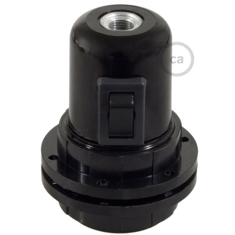 Il kit portalampada E27 in bachelite con doppia ghiera e interruttore serve ad assemblare una lampada da parete, da tavolo o da soffitto dotata di paralume. La bachelite (o bakelite) è una resina termoindurente che prende il nome dal suo inventore ed evoca immediatamente telefoni, radio e oggetti d'uso comune negli anni ‘50 e ‘60. È un materiale leggero, resistente e, se verniciato, molto lucido! La presenza dell'interruttore consente di accendere o spegnere la lampadina ed è utile nei casi in cui manchi un interruttore a parete o infracavo. Il kit portalampada E27 in bachelite con doppia ghiera per paralume e interruttore fa per te se: - intendi utilizzare un elemento schermante - desideri un portalampada semplice che valorizzi e lasci ben visibile la tua lampadina - non disponi di un interruttore a parete o infracavo. Per configurare e completare il kit portalampada E27 in bakelite filettato per paralume e interruttore: - utilizza i menu per definirne le caratteristiche - completa