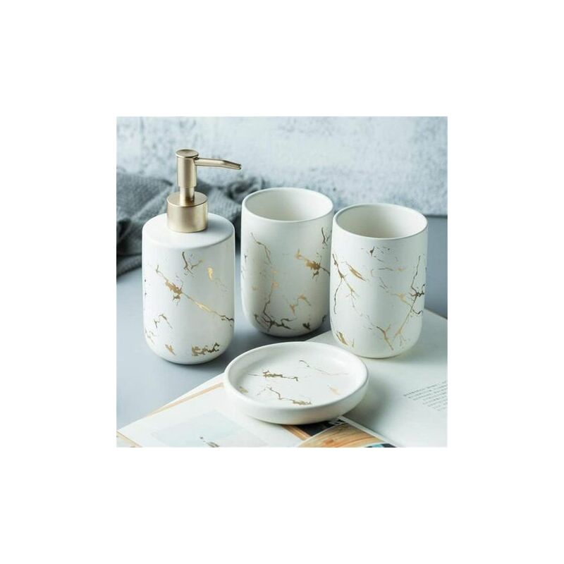 MATERIALE ECOLOGICO - Pratico set da bagno in ceramica. Idrorepellenti, resistenti e facili da pulire. ENJOY LIFE - i set di accessori per il bagno donano un tocco di eleganza ai tuoi mobili da bagno con i loro colori tenui e il design semplice e moderno. Puoi creare facilmente un ambiente caldo simile a una spa nel tuo bagno. I SET COMPRENDONO - 1 dispenser di sapone, 1 portasapone e tazza per spazzolino da denti, 1 tazza per colluttorio. Un set completo di accessori per il bagno che ti offre un accesso più comodo ai prodotti per la pulizia e mantiene il bagno pulito, ordinato e asciutto. VARIE POSSIBILITÀ DI UTILIZZO - Set di accessori da bagno in 4 pezzi in bianco perfetto per il padrone, bagno della famiglia o degli ospiti. Può anche essere un regalo perfetto per la tua famiglia e i tuoi amici, o per i tuoi colleghi e clienti.