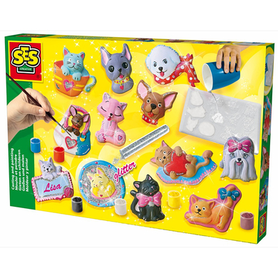 Con il set per la colata di gesso si possono realizzare simpatici gatti e cani. Mescolare la massa di gesso secondo le istruzioni, versarla nello stampo e lasciarla indurire. Quindi dipingere gli animali e decorarli con i brillantini. I simpatici animali alla moda sono pronti. Molto semplice! Dettagli del prodotto: Dimensioni (lunghezza x larghezza x altezza): 4 x 30 x 20 cm. Contenuto: massa di gesso, stampo, 6 colori, pennello, tubo con glitter, istruzioni. Gesso ad asciugatura rapida Dipingere le figure in gesso con i colori più belli Colori brillanti e buona opacità dei colori Incoraggia la creatività I colori e il gesso sono facili da lavare e da eliminare Materiale stampo: plastica Età: da 5 anni Attenzione Non adatto ai bambini di età inferiore ai tre anni. Contiene piccole parti che possono essere ingerite. Pericolo di soffocamento!