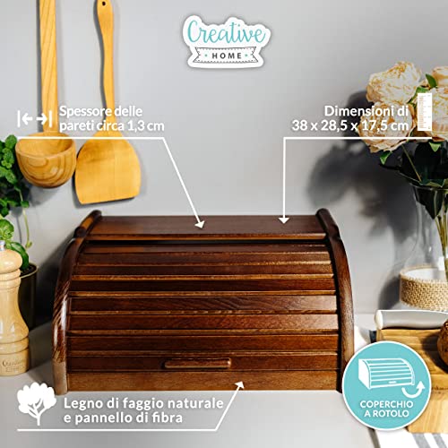 Creative Home Porta-Pane Legno Marrone | Moderno | 38x28,5x17,5cm (+/-1cm) | Contenitore Pane | Coperchio Scorrevole Avvolgibile | Apertura Frontale a Scomparsa | Faggio Naturale | Accessori Cucina