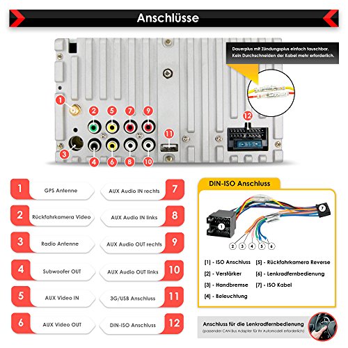 17,8 cm (18 cm) capacitivo multi-touch display - 200 W (4 x 50 W) - Radio con funzione RDS - Antenna DAB + radio digitale (disponibile separatamente) - DVD Player - 2 x slot micro SD per navigatori satellitari e i vostri file audio e video in/out - connessione usb frontale e posteriore per dispositivi esterni, come ad esempio lettori DVD Audio/Video In poggiatesta, DVB-T2 TV, ecc. supporto pulsante RGB colori - Rear View Camera Connection telecomando da volante regolabile.