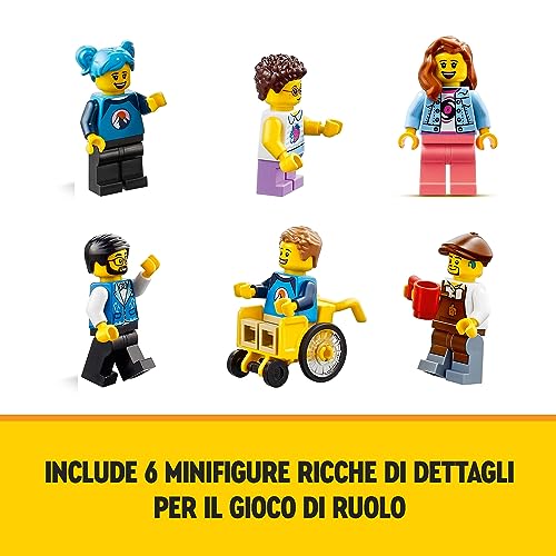 Include 6 minifigure LEGO: un cantante e un chitarrista che si esibiscono sul tetto del negozio di musica, un barista, un addetto alla reception dell'hotel, una minifigure su sedia a rotelle e un bambino