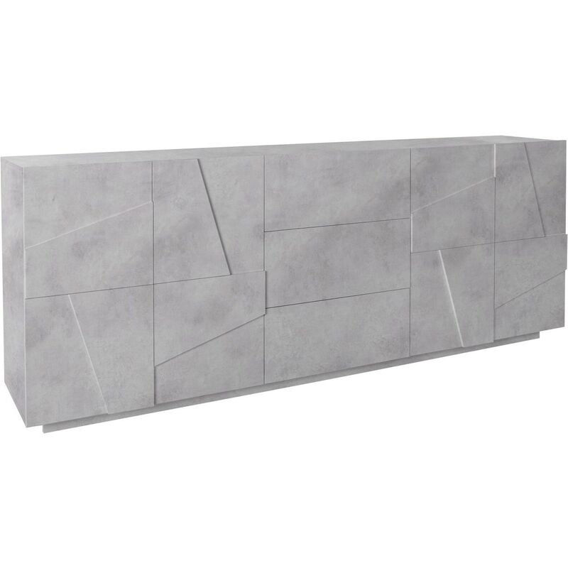 La credenza 4 ante 3 cassetti da 220 cm PING è una soluzione utile sia in soggiorno sia in sala da pranzo. Grazie ai molteplici spazi offerti si rivela un mobile pratico e capiente dal design originale ed elevata funzionalità 100% made in Italy. La credenza PING è costituita da quattro ante a battente rese particolari dall'intaglio geometrico in rilievo sulla superficie che rendono la credenza del tutto moderna e di tre cassetti con apertura push to open . Al suo interno ci sono 2 ripiani in legno che garantiscono ampio spazio di utilizzo e di archiviazione. La struttura, le ante e i cassetti sono realizzati in melaminico color cemento. Viene fornita in kit di montaggio e dotata di istruzioni semplici e dettagliate.