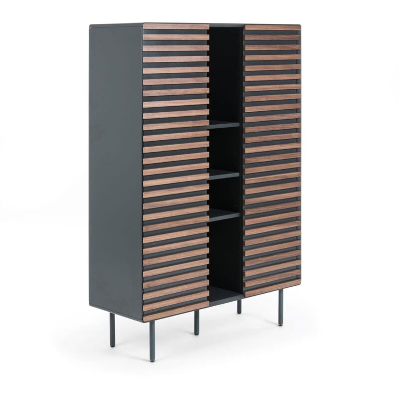 Credenza alta Kesia 105 x 155 cm Dal design di tendenza ispirato alle strutture a vista, la libreria Kesia è impiallacciata in noce sia sul fronte che sul retro. Quindi, se vuoi usarla come divisorio per gli ambienti, continui a mantenere lo stile nello spazio. Codice del prodotto: Nero Materiale principale: Legno Período: Moderno Dimensioni: Altezza: 155 cm Larghezza: 105 cm Profondità: 40 cm Peso del prodotto: 81 kg