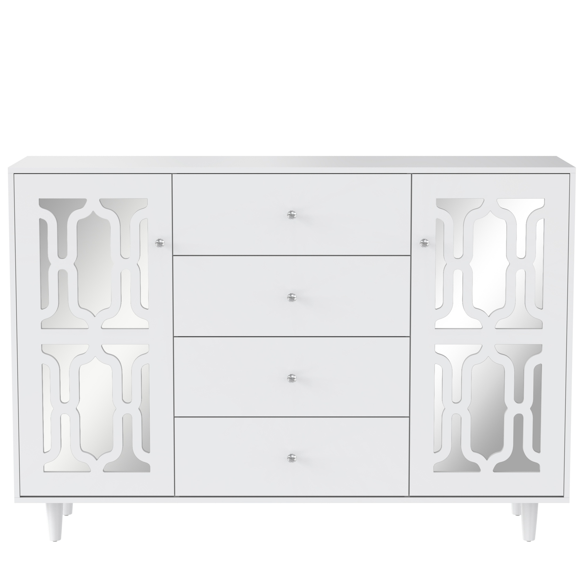 Il Credenza specchiata bianca con eleganti maniglie di cristallo fredde è perfetta per il soggiorno e la sala da pranzo, con dimensioni di 147,5 x 40 x 102 cm. Con un design coordinato nei colori, ante in vetro e processo di blister integrato, questo mobile offre stile e funzionalità. Realizzato con pannelli in MDF di alta qualità e piedini in legno massiccio, garantisce robustezza e affidabilità. Dotato di due ante con inserti in vetro e quattro cassetti centrali, offre un'ampia capacità di archiviazione. Facile da montare grazie alle parti contrassegnate e alle chiare istruzioni, consigliabile l'assemblaggio a due persone.