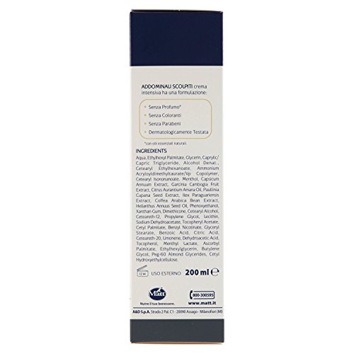 Addominali Scolpiti crema intensiva è:· Senza profumo· Senza Coloranti· Senza Parabeni· Dermatologicamente testata· Con olii essenziali naturali