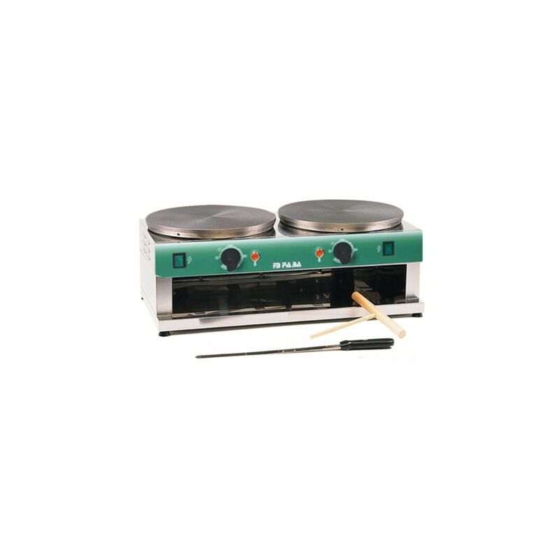 Codice RS0685 - Crepiera tonda doppia elettrica, modello FF-D40, 400 volt, 5500 watt, dimensioni cm. 81x47x25 (lxpxh), diametro piastre cm. 40+40 senza incavo perimetrale. Struttura in acciaio inox. Piano di cottura in ghisa idonea per alimenti. Dotata di termostato per la regolazione della temperatura e termostato di sicurezza.