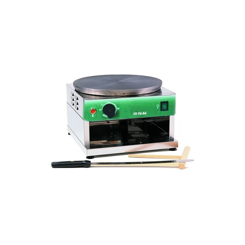 Codice RS0666 - Crepiera tonda elettrica, modello FF-S35, 230 volt, 2.0 kw, dimensioni cm. 35x37x25 (lxpxh), diametro piastra cm. 35 senza incavo perimetrale. Struttura in acciaio inox. Piano di cottura in ghisa idonea per alimenti. Dotata di termostato per la regolazione della temperatura e termostato di sicurezza.
