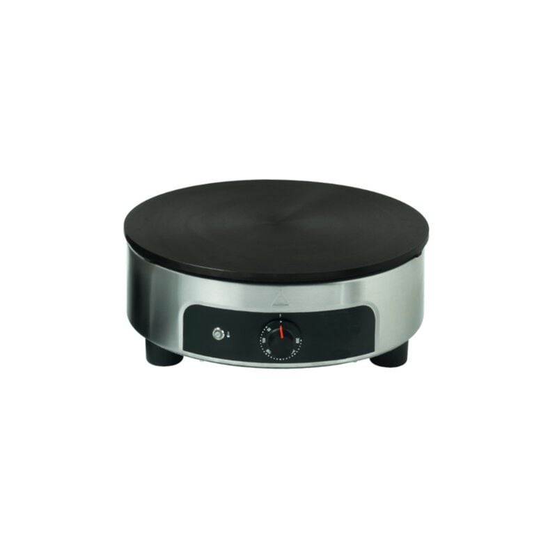 Codice RS7835 - Crepiera tonda elettrica modello ME-EST40T, 230 volt, 3.0 kw, dimensioni cm. 40x16 (dxh), diametro piastra cm. 40. Temperatura di lavoro 50-300 °C. Struttura in acciaio inox, piastra di cottura in ghisa con superficie multirighe antiscivolo.