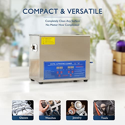 TEMPERATURA E TEMPO REGOLABILI: Consiglia di utilizzare questo pulitore ad ultrasuoni con una temperatura di pulizia di 20 ~ 80 ° C per migliorare le prestazioni di pulizia. È anche possibile preimpostare il tempo di pulizia 0-30 minuti con praticità.