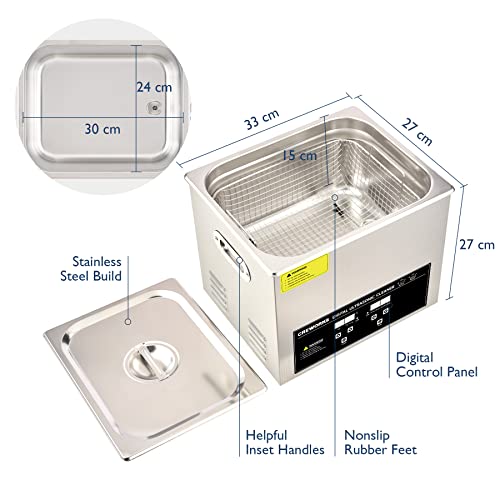 LA SOLUZIONE ALLO SPORCO OSTINATO: questa macchina per la pulizia a ultrasuoni da 10 litri di Creworks ha 240W di potenza, un riscaldatore da 300W, un timer e un pannello digitale per un facile utilizzo, garantendo una pulizia accurata di aree complesse e difficili da raggiungere