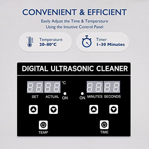 INSTALLAZIONE MAI PIÙ COMPLICATA: dai il benvenuto al funzionamento semplice con il pannello di controllo intuitivo della nostra macchina per la pulizia a ultrasuoni, che ti consente di impostare il tempo di pulizia fino a 30 minuti e la temperatura tra 20 e 80°C con la semplice pressione di un pulsante