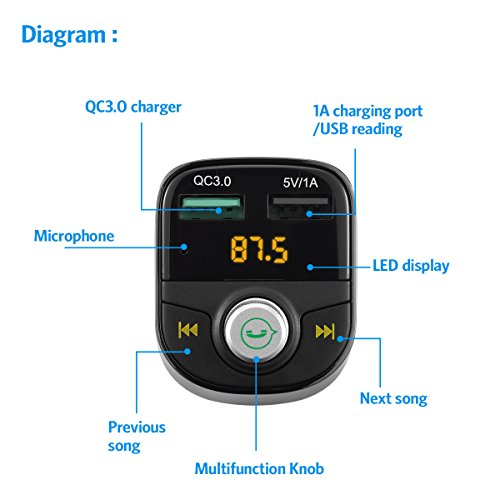 Criacr Bluetooth Transmetteur FM, Adattatore Trasmettitore FM per Auto Wireless con Chiamata a Mani Libere, Fast Charge 3.0, Supporto USB Flash Disk, per iPhone, Smartphone Android, Tablet PC