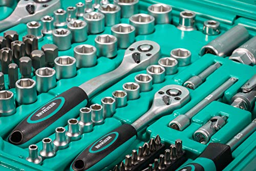 CONTENUTO - set attrezzi per avvitare da 171 pezzi in lega di acciaio in cromo e vanadio. Avvitatori e bussole con maschio e femmina da 1/2″, 3/8″ e 1/4″ per punte a taglio, Torx, PH, PZ e a brugola applicabili.