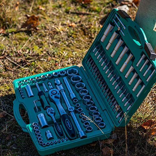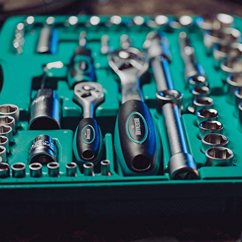 Set cricchetti e bussole da 110 pezzi | WIESEMANN 80126 | lega acciaio in cromo e vanadio | bussole e punte | 1/2″ | 1/4″ | bussole con bocca esagonale | punte PH e PZ | valigetta per trasporto