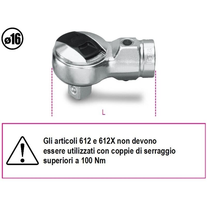 Cricchetti reversibili per barre dinamometriche. Attacco: 3/8 - 16 mm Lunghezza: 66 mm Tipologia: Cricchetto Reversibile: Si Utilizzo: Barra dinamometrica Limite: 100 nm