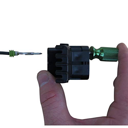 Strumento di rilascio del terminale Weatherpack. Rilasciare i terminali in modo sicuro senza danneggiare il cablaggio del veicolo o la morsettiera. Albero in acciaio inox e manico in alluminio anodizzato con superficie zigrinata per una migliore presa e controllo.