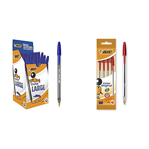 BIC Cristal Large Pennea Sfera Con Punta Ampia (1.6 Mm), Blu, Confezione Da 50 & Cristal Original Penne A Sfera, Punta Media (1.0 Mm), Rosse, Pacco Da 4 Penne