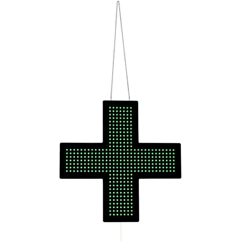 Croce LED farmacia verde monocolore per interni, in policarbonato. È dotata di una catena sul retro che ne consente l'accensione, lo spegnimento e la variazione dello schema luminoso. Si installa facilmente a sospensione dal soffitto, a parete o in vetrina. Il suo grado di protezione IP20 la rende adatta all'uso in interni. È perfetta per mettere in risalto e promuovere la propria farmacia.