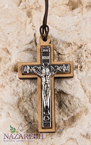 Croce in legno di ulivo placcata argento, pendente a forma di crocifisso, realizzata a mano a Betlemme, 4,57 cm
