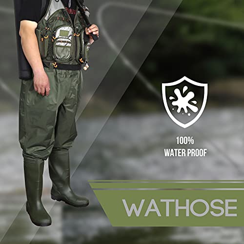 Impermeabile - Materiali in PVC e nylon di alta qualità, abbinati a stivali di gomma e poi utilizza la tecnologia avanzata di legame, una perfetta combinazione di materiale e tecnologia, rende questi waders completamente impermeabili. Puoi mantenere asciutti i pantaloni e le calze.