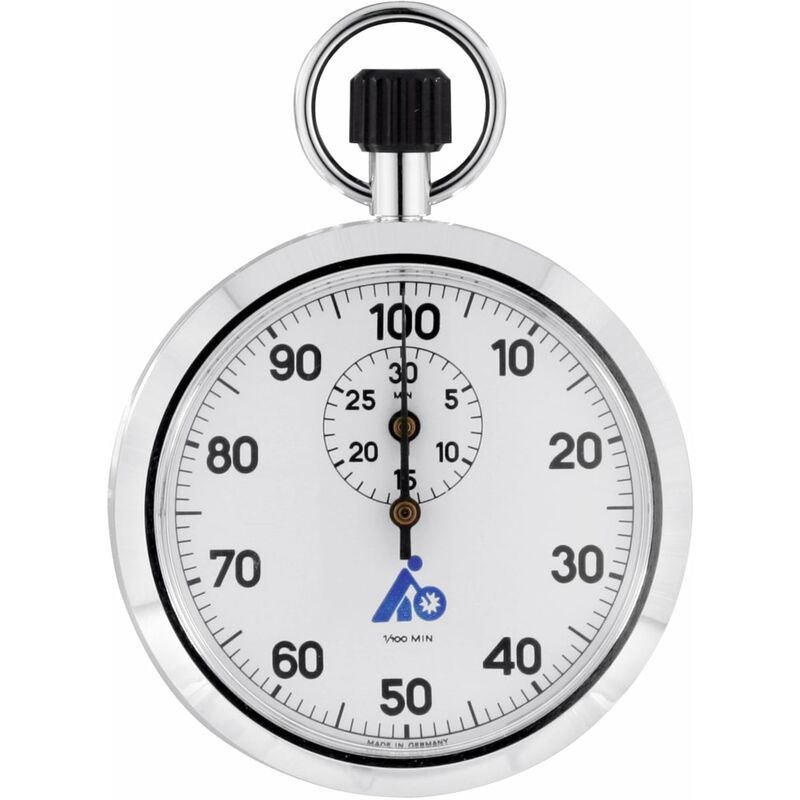Ancora di protezione sulla corona. Cronometro semplice e robusto. Valore scala 1/100 min per la misura cronometrica dei cicli. Uso: Start, stop e azzeramento mediante la corona. Dati tecnici Taratura N1 Metrologia analogico Tipo di prodotto Cronometro Risoluzione 1/100 min Registra per, min 30