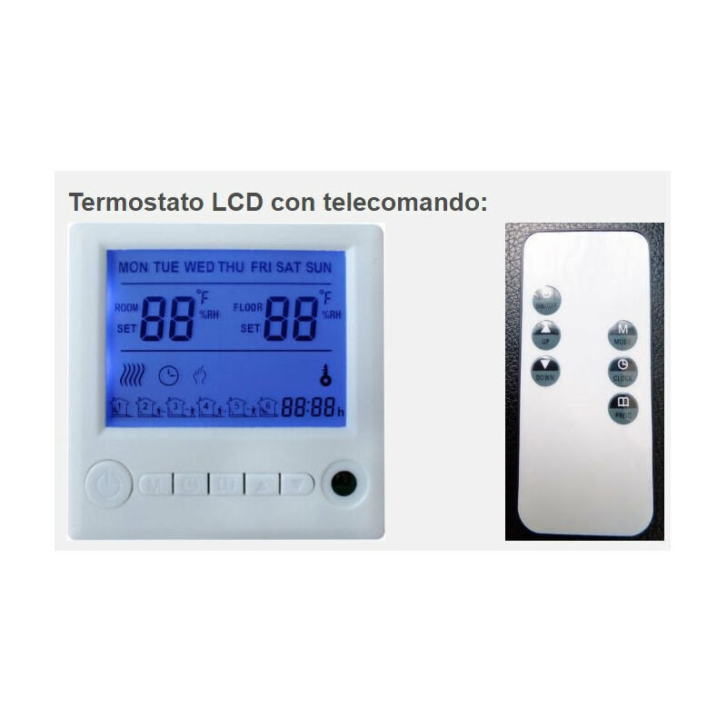 Termostato Cronotermostato Termostato Digitale da Parete con Telecomando Sined Bianco Cronoermostato e telecomando per riscaldatori infrarossi, è utilizzato principalmente nel controllo della temperatura di riscaldamento elettrotermico Chip di controllo avanzato del microcomputer 6 intervalli di tempo con programmazione settimanale. Il sensore di temperatura del termostato per riscaldatori infrarossi rileva automaticamente la temperatura esterna confrontandola con quella impostata, e all'ora desiderata dall'utente accende automaticamente il riscaldatore ad infrarossi. Al raggiungimento della temperatura desiderata il termostato spegnerà automaticamente il pannello a infrarossi. Questo per assicurare un perfetto e omogeneo uso del pannello riscaldante per un risparmio ottimale dei consumi ed una più durevole vita dei pannelli stessi. Può essere installato sia ad incasso che a parete e riesce a comandare più riscaldatori fino ad un massimo di 15 ampere (15A). Punti di Forza