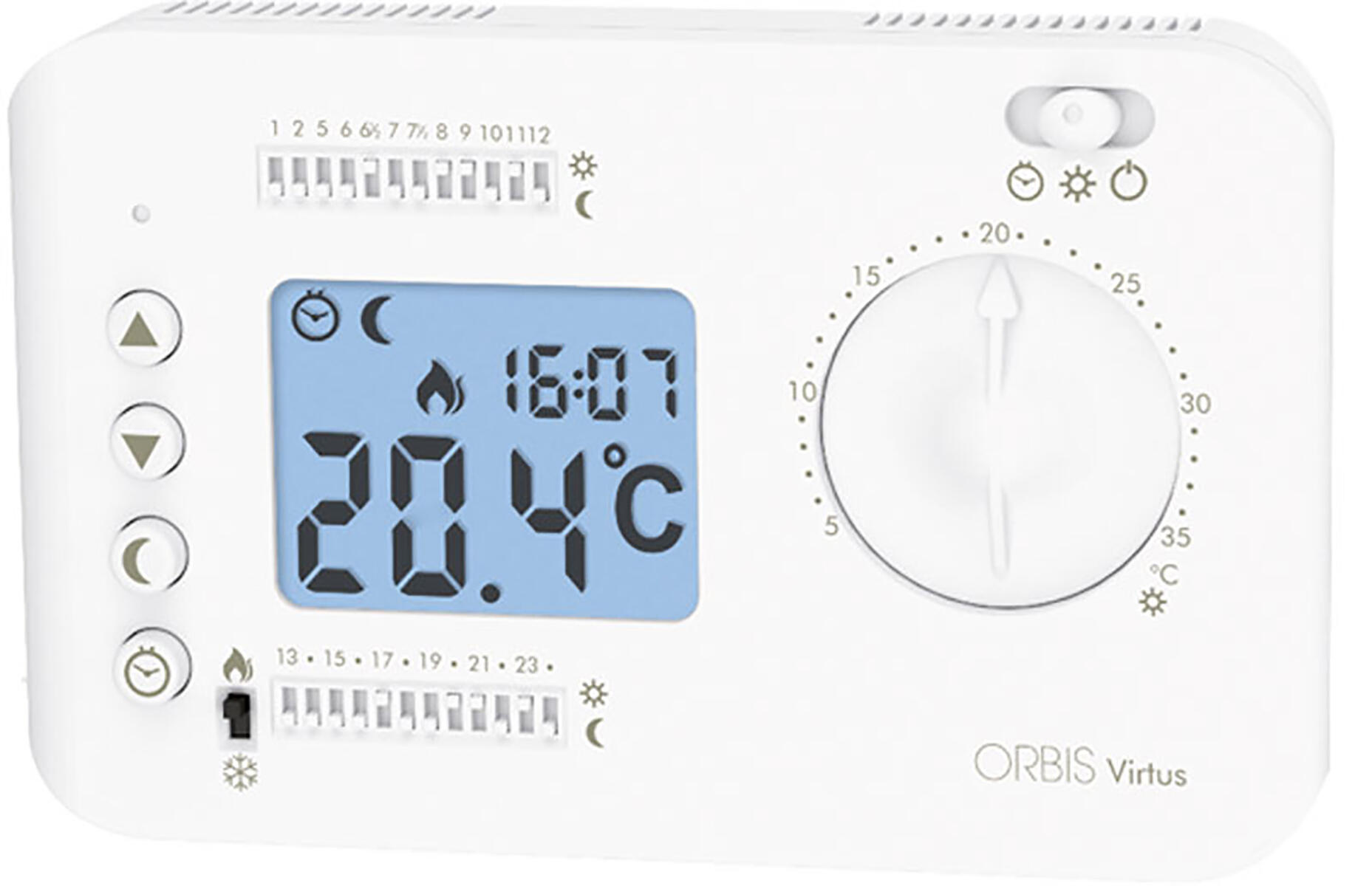 Cronotermostato digitale a programmazione giornaliera tramite 24 microinterruttori orari, due livelli di temperatura regolabili (Comfort e Risparmio), modalità funzionamento Riscaldamento/Condizionamento, modalità funzionamento Automatico/Manuale, funzione antigelo, fissaggio parete, colore bianco