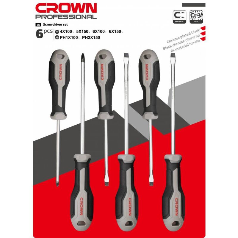 Crown set 6 pezzi cacciaviti assortiti 4x100, 5x150, 6x100?6x150, ph1x100, ph2x150 L'offerta ed i prezzi si riferiscono a 6 pz. per confezione