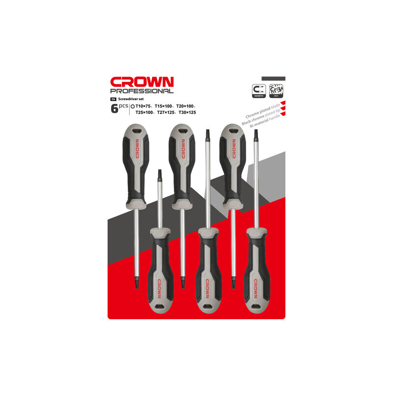 Crown finitura cromata, punta nera e impugnatura bi-materiale. Magnetici. Contenuto: 6 cacciaviti torx: T10×75, T15×100, T20×100, T25×100, T27×125, T30×125. L'offerta ed i prezzi si riferiscono a 6 pz. per confezione