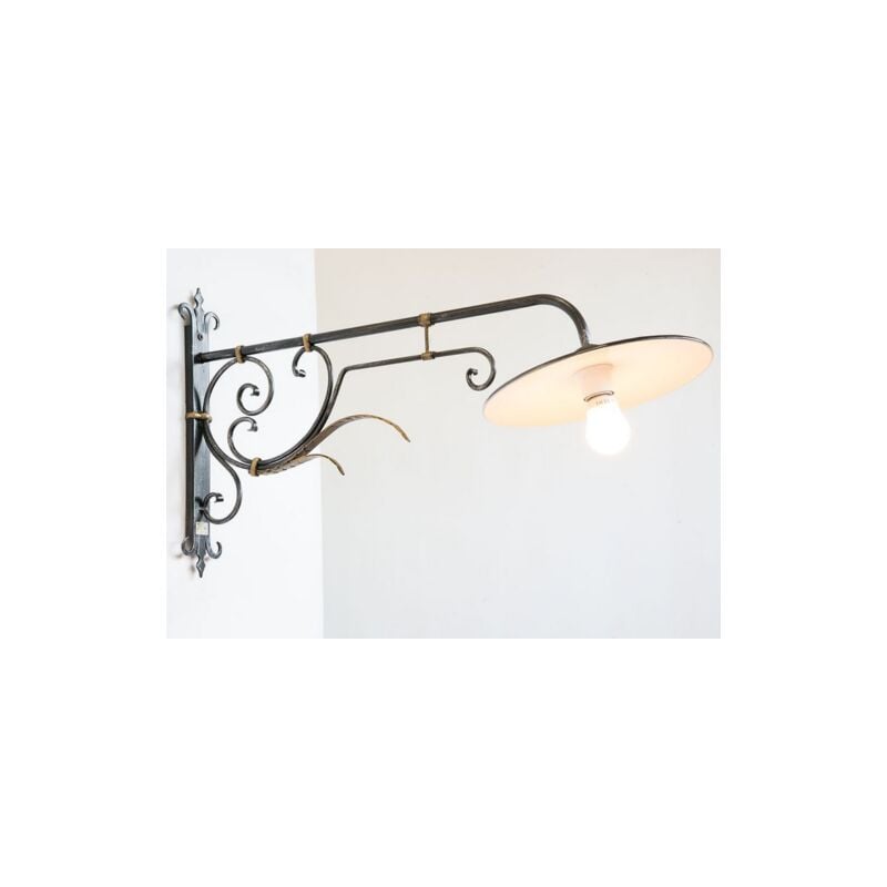LAMPADA APPLIQUE LANTERNA FERRO BATTUTO CON PIATTO LUX D.32 LANTERNE LAMPADE PLAFONIERA Lampada dal design ispirato all'illuminazione degli anni '50, quando l'energia elettrica raggiungeva le case degli italiani. Elemento caratterizzante era il disco in lamiera che proteggeva la lampadina dalle intemperie. I nostri designer hanno reso attuale questo cult dell'illuminazione riadattandolo ai canoni moderni. La struttura è in ferro nero con patinature argento, impreziosita da riccioli forgiati a mano, tenuti insieme da fascette dorate. Il piatto in ferro è smaltato a caldo, processo che ne rende la superficie lucida e brillante proprio come negli anni '50, ed intensifica la luce riflessa. La lampada Piatto Lux è stata progettata per resistere a lungo esposta agli agenti atmosferici. Da abbinare agli altri complementi della collezione. Dimensioni: 32 ↔ x 90 ↗ x 49 ↑ cm Paralume: Piatto smaltato Ø cm 32 Consiglio d'uso: Lampada progettata per illuminare gli ambienti esterni come il