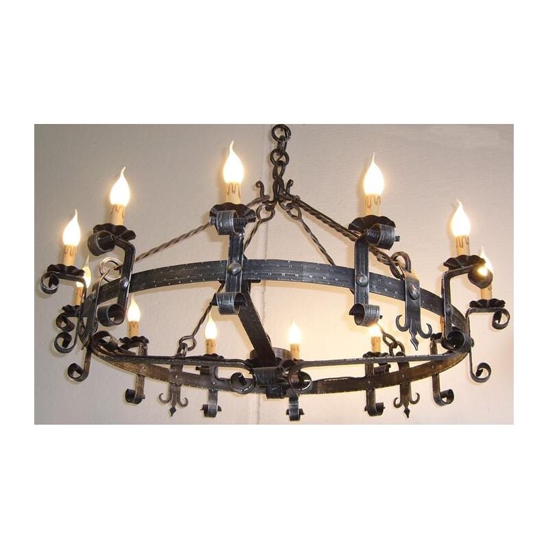 LAMPADARIO 'FORGIA' 12 LUCI Cruccolini Questa linea è di origini antiche, quando per illuminare i grandi saloni dei castelli, si usavano supporti per candele in cera. I designer della Cruccolini si sono ispirati a questi per realizzarne una versione moderna ed elettrificata per illuminare le case di oggi. Questo robusto lampadario di ispirazione medievale, è realizzato interamente in ferro battuto forgiato a mano, di colore nero con patinature argento per un effetto anticato che esalta i rilievi dell'accuratissima lavorazione. Il lampadario è sormontato da robuste catene che poggiano su tiranti a forma di giglio mentre forgiature arricciate supportano le lampade. I lampadari della linea ''Forgia'' sono in grado di trasformare qualsiasi ambiente in un vero e proprio castello. Da abbinare agli altri complementi della collezione. Dimensioni: Ø 110 x 85 ↑ cm Massima estensione: 115 ↑ cm Lunghezza catena: 30 ↑ cm Consiglio d'uso: Questo lampadario è perfetto per divenire il punto focale