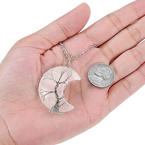 Tree of Life Crystal Necklace Rose Quartz Crystal Necklace Wire Wrated Crescent Moon Pendant Necklace Reiki Healing Crystal Stone Handcrafted Jewelry con Gift Box for Women Girls