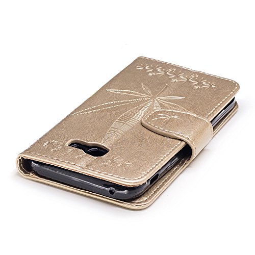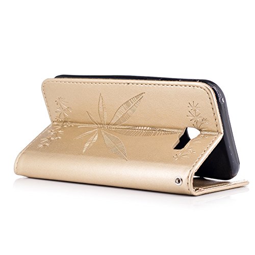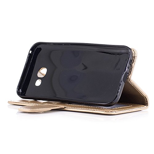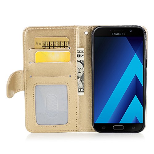 CSNMALL Copertura di cuoio molle TPU / PU di ForFor della galassia A7 2017 di Samsung, modello in rilievo di acero, cassa del raccoglitore con il supporto e la scanalatura della carta di sconto e la cordicella, facile accedere a tutte le porte, i tasti e le caratteristiche del telefono ( Color: Gold )