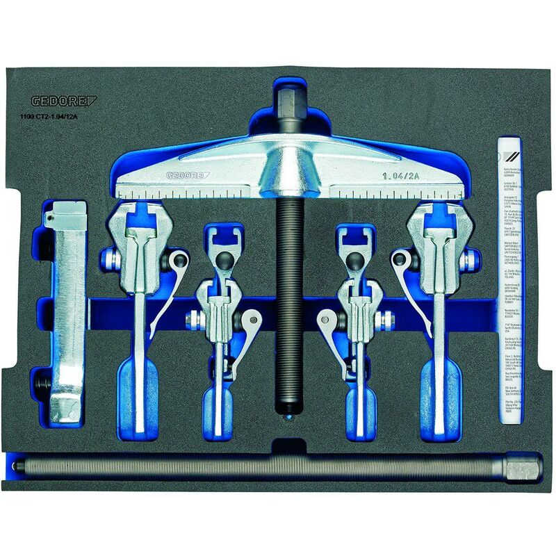 Per apertura fino a Ø 200 mm per esterni, Ø 70-260 mm per interni e profondità di serraggio fino a 300 mm, Punta della vite (a sfera o a punta) reversibile per viti 3 e 4, Bracci a sgancio rapido con profilo a T integrato per una migliore trasmissione della forza, Griffe forgiate molto sottili ideale per punti di difficile accesso, 2 prolunghe in acciaio mm 100 e 150 con pulsante di fermo per una rapida regolazione dei bracci, 1100 CT2-1.04/12A per l'ampliamento della L-BOXX® da 136 utensili già presenti, Con inserto Check-Tool per poter identificare immediatamente se manca un utensile, Utensili completamente approfonditi in espanso, in questo modo l'inserto attrezzato è impilabile Distanza di estrazione esterna (max.) [mm] 200 mm Contenuto per set 1.04/1A 1.04/2A 1.2106350KS 1.1406200 106/A-100-VB 106/B-150-VB EI-1100 CT2-1.04/12A Larghezza di serraggio estrattore interno a2 (min.) [mm] 70 mm Profondità di serraggio utilizzabile b [mm] 300 mm Larghezza totale [mm] 310 mm Peso netto