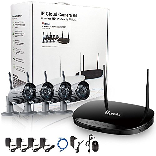 Ctronics Wireless Security Camera Set 2.4G Sistema NVR HD. Incluso 4 telecamere IP wireless 960p con funzione Night Vision per montaggio esterno Preconfigurato professionale (1 TB HDD)