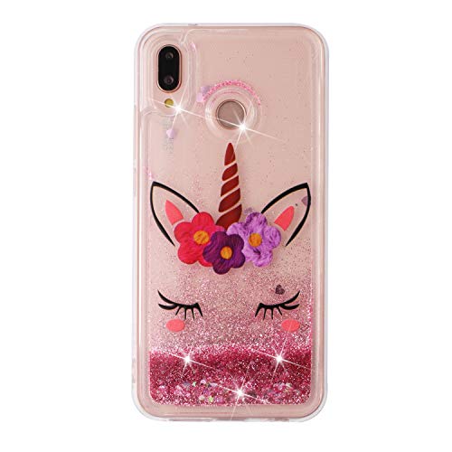 CUAgain Cover Compatibile per Huawei P20 Lite Silicone Trasparente 3D con Disegni Antiurto Glitter Bling Case Liquido Transparent Acqua Gomma Cover Bumper Custodia per Donna Uomo,Unicorno Rosa