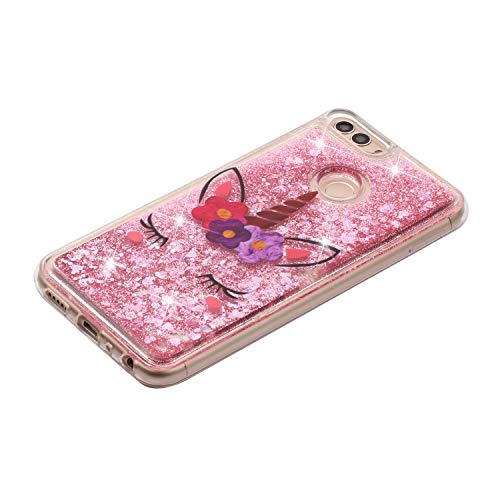 CUAgain Cover Compatibile per Huawei P Smart 2018 Silicone Trasparente 3D con Disegni Antiurto Glitter Bling Case Liquido Transparent Acqua Gomma Cover Bumper Custodia per Donna Uomo,Unicorno Rosa