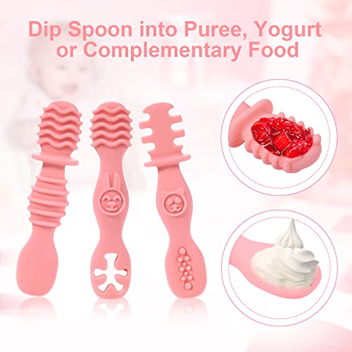 3pz Cucchiai In Silicone per Bambini, Senza BPA Cucchiaio Addestramento Cucchiai per Svezzamento Cucchiai Autoalimentati per Bambini da 6 a 12 Mesi (Rosa)