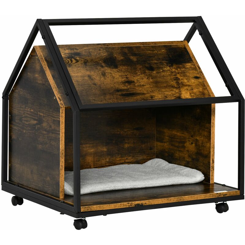 Cuccia Cuccia per Gatti 60x50x60,5 cm in Legno e Acciaio Marrone Rustico I tuoi gatti meritano un posto confortevole in cui rilassarsi e schiacciare lunghi pisolini. Con la casetta per gatti non solo rendi felici i tuoi amici a 4 zampe ma aggiungi un tocco di eleganza ai tuoi ambienti. La struttura in legno e acciaio dallo stile industriale unisce solidità e design in un posto solo. La porta la porta della cuccia per gatti è ampia ed è presente un cuscino con morbida imbottitura facile da pulire. DESIGN ACCATTIVANTE: Questa cuccia per gatti con design in stile industriale non solo sarà un comodo rifugio per i tuoi amici a 4 zampe ma diventerà anche un elegante complemento di arredo nella tua casa. SPESSA IMBOTTITURA: La casetta per gatti include un morbido cuscino, che assicura sonni confortevoli e rilassanti. Il cuscino è rimovibile e lavabile in lavatrice. FACILE DA SPOSTARE: Le 4 ruote integrate permettono di spostare comodamente la casetta ovunque preferisci con il minimo sforzo.
