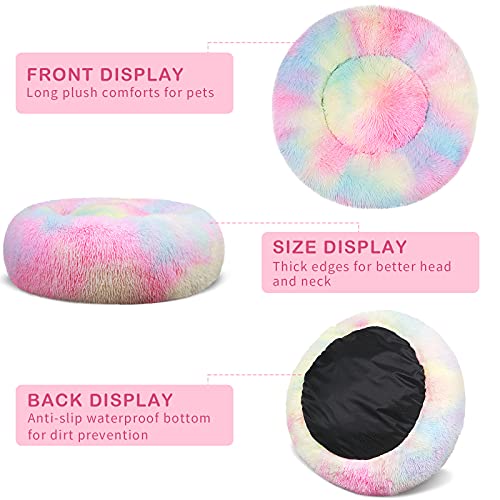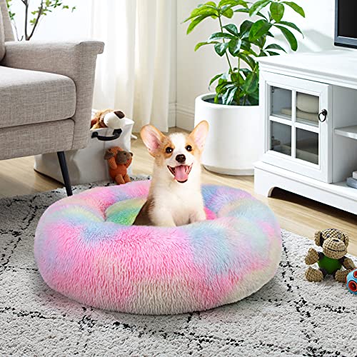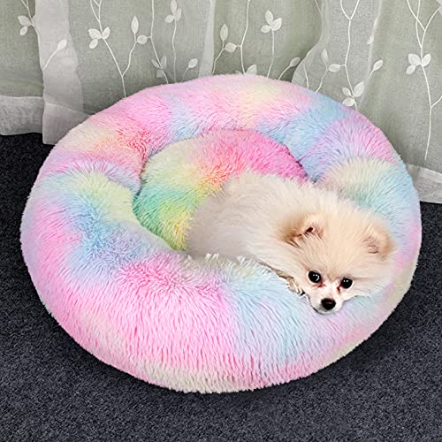 Letto per cani a ciambella colorato: il nostro lettino per cani ha una forma rotonda a forma di ciambella con colore arcobaleno. Il supporto rialzato intorno al bordo fornisce supporto al collo come cuscino, che aiuta cani e gatti ad alleviare dall'ansia e rende più facile per gli animali domestici a dormire profondamente. Questa cuccia per cani media permette ai vostri animali domestici di arricciarsi con il massimo comfort anche completo.