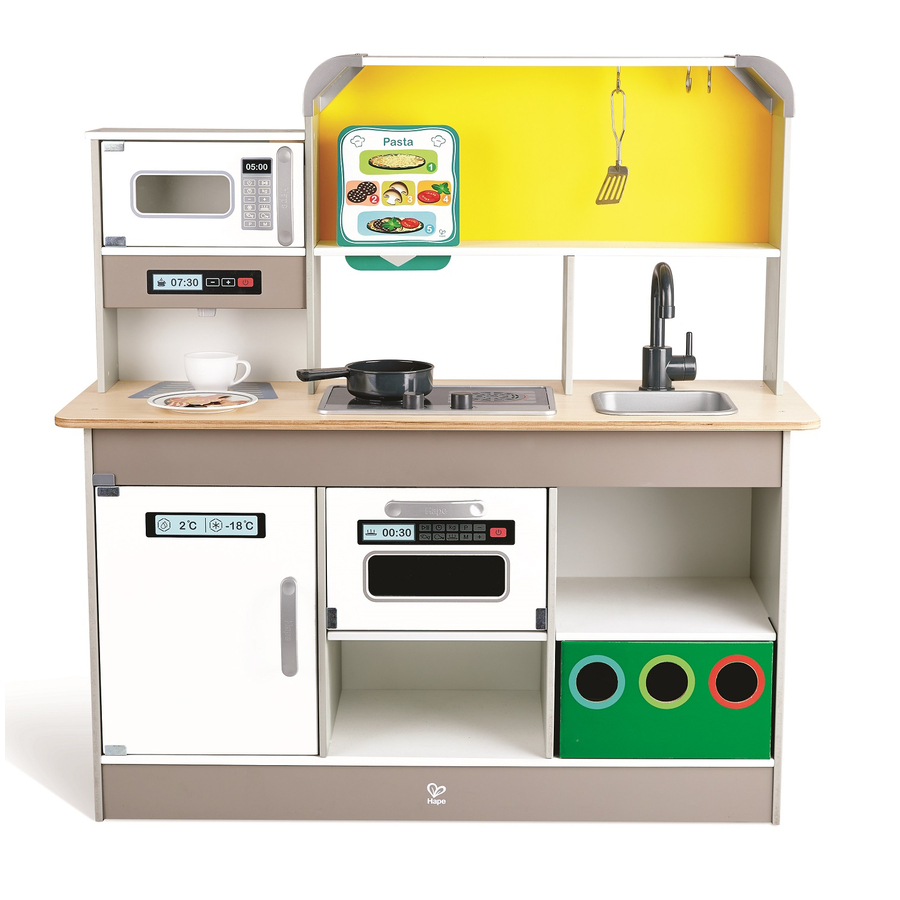 Preparate il cibo come i grandi! Con questa cucina giocattolo completamente attrezzata, potrete farlo. Include suoni di cucina, lus tiger padella con ventola, libro di ricette e molto altro ancora. La cucina giocattolo è dotata dei seguenti accessori: Microonde, caffettiera, piastre elettriche, lavello con rubinetto, forno, frigorifero, lavagna e cestino. Include una scheda informativa sugli alimenti a doppia faccia e un ricettario con sei piatti. Gli accessori comprendono una tazza da caffè, un piatto, una padella e una spatola. Il fornello può essere aperto con il cavo incluso aden . La piastra si illumina di rosso ed emette un suono di bolle, mentre l'altra piastra si illumina di blu ed emette un suono di cottura. La divertente tecnologia a ventaglio fa muovere il cibo nella padella come se stesse gorgogliando, sfrigolando o friggendo. Il cestino è dotato di diverse sezioni per introdurre i più piccoli alle regole del riciclo e alla tutela del Planet en in modo giocoso! Dettagli del prodotto: Dimensioni (lunghezza x larghezza x altezza): 29,7 x 88,6 x 90 cm Richiede 1 batteria da 3,7 V - 400 mAh (inclusa) Età: da 3 anni
