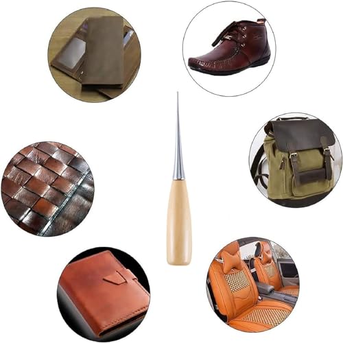 【Punteruolo Forato in Pelle】Set di Kit Pelle Attrezzi è realizzata in legno massiccio con una superficie liscia per una sensazione confortevole. L'ago è in acciaio inossidabile ad alta resistenza e può passare attraverso la maggior parte degli articoli in pelle, rendendolo molto facile da usare.