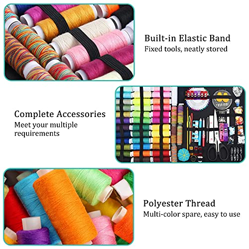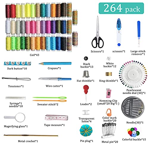 264 accessori da cucito premium: il kit da cucito portatile contiene 264 accessori da cucito,46 fili colorati diversi (ogni colore è lungo 120 metri),aghi,bottoni,spille,ganci,ditali,matite,infila,bottoni,spille da cucito,forbici e lente d'ingrandimento, metro a nastro,ecc.Questi accessori di cucito comodi e completi sono ampiamente utilizzati per adattarsi a qualsiasi cosa cuci.
